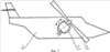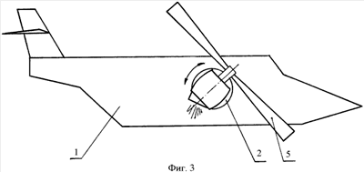 На фиг.1 и 2 схематично изображены фрагменты поперечного сечения двух вертолетов с консольной установкой несущих блоков на разных уровнях относительно фюзеляжа. На фиг.3 схематично показан вертолет предложенной конструкции с несущими блоками, отклоненными путем поворота консолей в положение, обеспечивающее ускоренный поступательный полет. Тяга реактивных двигателей при этом направлена почти вертикально и используется главным образом как поддерживающая сила.