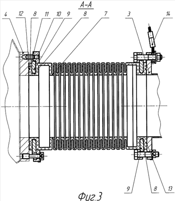 Торцевые поверхности полуколец 9 взаимодействуют с одной стороны с наружной стороной стыкуемого участка торцевого фланца сильфона 1, а с другой стороны – с внутренними торцевыми поверхностями уступов 10 прижимного кольца 11, установленного коаксиально на цилиндрической поверхности фланца сильфона 1 с возможностью поворота вокруг своей оси для удобства установки на фланце бортового обтекателя 4 и жесткого крепления к нему. При этом торцевая поверхность фланца бортового обтекателя 4 и торцевая поверхность фланца патрубка 3 со стороны сильфона 1 снабжены кольцевыми выступами 12, 13, обеспечивающими надежность и герметичность соединения фланца бортового обтекателя 4, сильфона 1 и патрубка 3.
