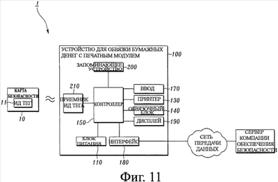 Устройство 100 для обвязки бумажных денег с печатным модулем включает в себя приемник 210 ИД-тега, запоминающее устройство 200, блок 110 питания, принтер 130, обвязочный блок 140, контроллер 150, узел 170 ввода данных, интерфейс 180, дисплей 190 и другие компоненты (не показаны), включая в себя блок тревоги, датчик и так далее, как показано на фиг.11. В этом устройстве 100 для обвязки бумажных денег с печатным модулем другие компоненты, за исключением приемника 210 ИД-тега, по существу, являются теми же, что пояснялись выше, и, таким образом, будут описаны только кратко.