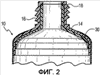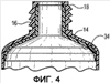 Фиг. 1 представляет собой перспективное изображение с пространственным разделением тюбика-контейнера 10, который имеет барьерный блок в пояске/горлышке. Тюбик-контейнер 10 имеет корпусную часть, сегмент пояска 14 и горлышко 16. Горлышко обычно имеет наружную резьбу 18 для присоединения крышки 26. Горлышко имеет выходное отверстие 20 для тюбика-контейнера 10. Барьерный блок 22 имеет секцию 24, которая по форме соответствует внутренней стенке пояска 14 и горлышка 16 тюбика. Этот барьерный блок размещается между пояском/горлышком 14/16 и дозируемой субстанцией, помещенной в тюбик 12. Барьерный блок может быть трехмерным блоком, имеющим форму, которая соответствует форме пояска/горлышка 14/16 и представляет собой преграду, пригнанную к пояску/горлышку 14/16, как показано на Фиг.2, пленочным блоком, который присоединен к внутренней стенке пояска/горлышка 14/16, как показано на Фиг.3, или барьерным блоком, который представляет собой соэкструдированный слой на внутренней поверхности пояска/горлышка 14/16, как показано на Фиг.4.