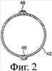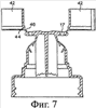 За одно целое с выступом 16 отформованы две полуобечайки 42, присоединенные к нему соответствующими, диаметрально противоположными, выполненными за одно целое шарнирами или перемычками 40. На фиг.7 показано положение полуобечаек 42 относительно остальных частей колпачка, когда он извлекается из пресс-формы, в которой этот колпачок изготавливается. Полукруглая кромка каждой полуобечайки, ближайшая к выступу 16, выполнена с элементом 44 защелкивающегося соединения, комплементарным по форме наружной кромке выступа 16. Две прямые кромки, проходящие в осевом направлении каждой полуобечайки, также выполнены с комплементарными защелкивающимися элементами, при этом одна кромка на каждой полуобечайке имеет обычно элемент 46 с канавкой крючкообразного или U-образного профиля, а другая кромка имеет комплементарный радиальный выступ 48.