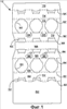Первая и вторая боковые панели 62, 74 и первая и вторая промежуточные панели 66, 70 выполнены с несколькими фигурными отверстиями 52 для приема части фланцевой верхней части бутылки В. Кроме того, первая и вторая промежуточные панели 66, 70 снабжены комплементарным запирающим или закрепляющим механизмом, который в этом варианте содержит, по меньшей мере, один охватываемый язычок 54, имеющий форму, позволяющую ему входить в соответствующую форму охватывающего отверстия 56. В этом варианте охватываемые язычки 54 частично выбиты из второй промежуточной панели и частично из второй нижней панели 72 так, что зацепляющая часть каждого выступающего язычка определяется фасонной линией разреза, и каждый охватываемый язычок 54 остается шарнирно соединенным со второй нижней панелью 72. Аналогично ответные охватывающие отверстия 56 образованы фасонным язычком 56, выбитым из первой промежуточной панели 66, и шарнирно соединены с ней по линии сгиба или ослабленной линии 57. Фасонный язычок 56 выполнен с возможностью перемещения из плоскости первой промежуточной панели 66 так, что в этой первой промежуточной панели формируется отверстие, в которое может быть вставлен охватываемый язычок 54. Охватываемый язычок 54 и охватывающее отверстие 56 имеют такую форму, чтобы охватываемый язычок зацеплялся и запирался в охватывающем отверстии 56.