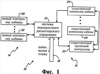 На Фиг.1 показана группа 16 существующих лифтов, структура которой включает существующий групповой контроллер 22 и существующие контроллеры 24 кабин. Если система 12 перекрестного диспетчерского управления направляет вызов с этажа к группе 16 существующих лифтов, этот вызов с этажа попадает к существующему групповому контроллеру 22. С учетом информации о статусе кабин, поступающей от существующих контроллеров 24, существующий групповой контроллер 22 принимает решение, какая кабина должна обслуживать вызов с этажа, и дает управляющую команду на конкретный контроллер 24, который назначен для этого вызова с этажа.