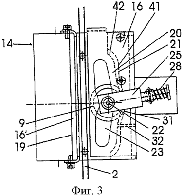 Ролик 9 установлен с возможностью вращения на оси 22 (на фиг.2 не показана, см. фиг.3), которая проходит через отверстие 23 в полке 16 и крепится в держателе 25.