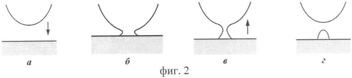 на фиг.2. представлены последовательные стадии процесса формирования бугорка нанометрового размера при использовании метода z-импульса, где а – зонд приближается к поверхности подложки, б – образуется контакт зонда с поверхностью подложки, в – зонд отводится, и «шейка», соединяющая зонд и поверхность подложки, становится тоньше, г – «шейка» рвется, на поверхности подложки остается бугорок из материала зонда.