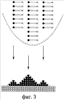 на фиг.3 представлена гипотетическая схема образования бугорков на поверхности подложки при испарении атомов из структурных каналов нанотрубок зонда сканирующего туннельного микроскопа;