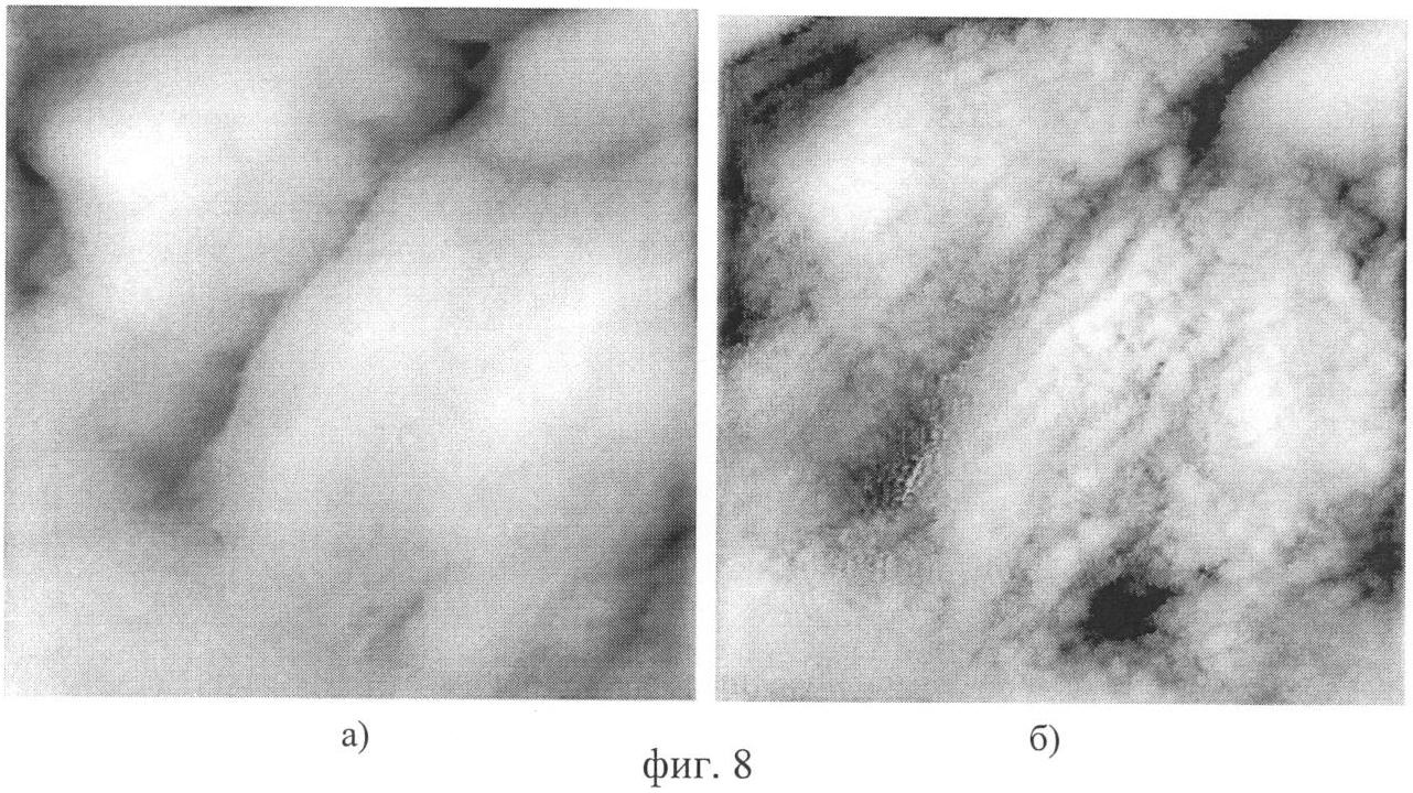 На фиг.8. показан характерный результат для основного наблюдавшегося процесса эмиссии атомов натрия из структурных каналов нанотрубок монокристаллического зонда из оксидной ванадиевой бронзы натрия на поверхность подложки. Оба кадра, 8а) – левый и 8б) – правый, получены сканированием на туннельном токе величиной 5 нА при напряжении сканирования +0,5 В на зонде. Размеры кадров – 100×100 нм, максимальный разброс высот – 9 нм на левом кадре и 10 нм на правом кадре.