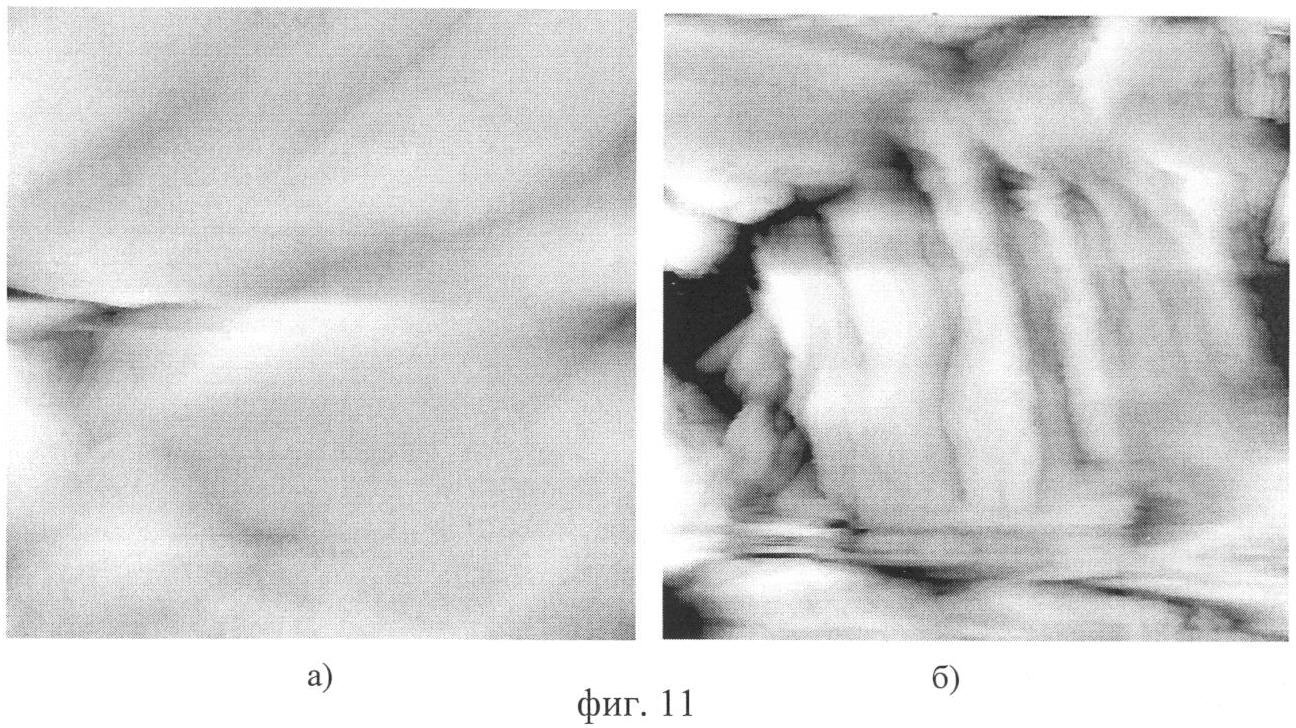 на фиг.11 приведен пример возникновения столбчатой наноструктуры на поверхности пленки золота после эмиссии в режиме равномерного сканирования всего поля исходного кадра в течение 100 с с параметрами атомной эмиссии и сканирования, аналогичного режиму фиг.8. Размер этих кадров – 1000×1000 нм, разброс высот на обоих кадрах – около 180 нм;