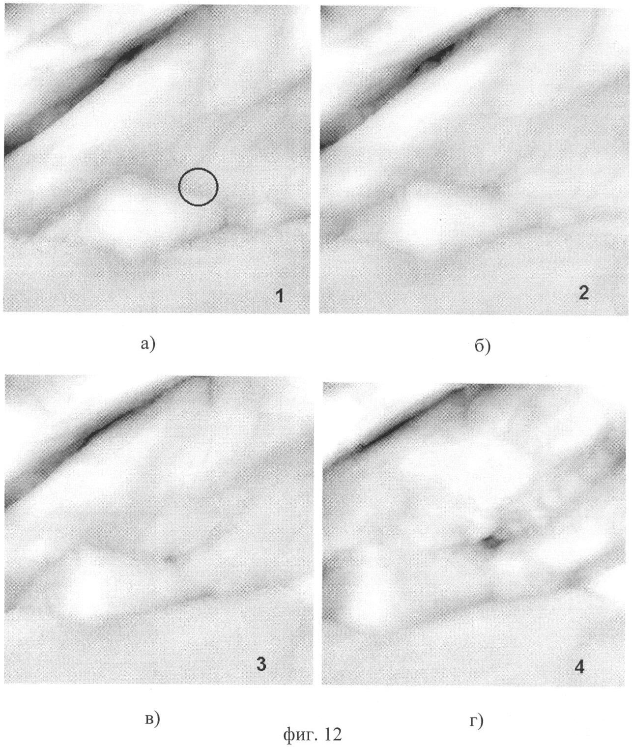 на фиг.12 показан процесс формирования ямки при десорбции атомов золота подложки в монокристалл оксидной бронзы натрия при распаде нанозерна размером более 100×100 нм на меньшие зерна после однократной десорбции аналогичным фиг.8 импульсом;