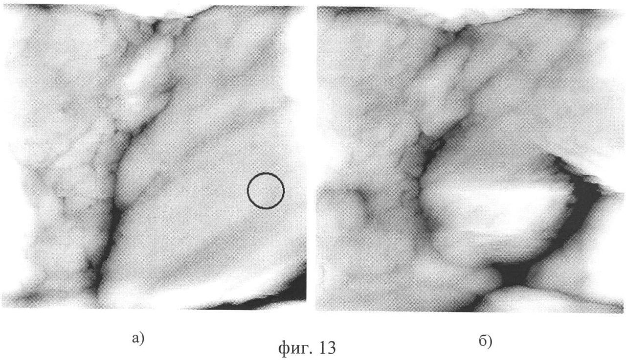 На фиг.12 показано, как после приложения напряжения +5 В в течение 5 с с током 5 нА при подводе зонда на расстояние 1 нм от подложки в точку, отмеченную на первоначальном кадре кружком, возникает сначала небольшое углубление, показанное на втором кадре. При последующих аналогичных циклах приложения напряжения это углубление развивается в итоге в показанную на четвертом кадре ямку размером около 20 нм диаметром и 15 нм глубиной. Размер всех кадров – 200×200 нм, максимальный разброс высот – около 40 нм. Следует отметить принципиальное отличие наблюдаемой полевой десорбции от адсорбции атомов натрия – локальность десорбции значительно выше и ненамного больше диаметра острия зонда, когда диаметр пятна адсорбции значительно больше, около 100 нм.