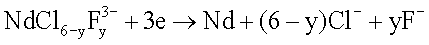 Изобретение относится к электролитическим способам получения неорганических соединений, в частности соединений неодима. Известен способ получения гексаборида неодима электролизом раплавленных сред. В состав ванны для электролиза входят окислы редкоземельных металлов и борный ангидрид с добавками фторидов щелочных и щелочно-земельных металлов для снижения температуры и вязкости ванны. Температура электролиза смесей составляет 950-1000°С, напряжение на ванне 3-15 В, плотность тока 0,3-3,0 А/см2. Состав ванны для получения гексаборида неодима: 1/15 Nd2O3+2B2O3+Li2O+LiF (Самсонов Г.В. Тугоплавкие соединения редкоземельных металлов. М.: Металлургия, 1964, стр.53-55). Этот способ взят нами за прототип. Недостатками этого способа являются высокая температура синтеза и сложность отделения целевого продукта от расплавленного электролита из-за низкой растворимости боратов и фторидов, загрязнение побочными продуктами, в частности боратами. Задача изобретения – получение чистого наноразмерного порошка гексаборида неодима без образования побочных продуктов и снижение температуры процесса синтеза. Сущность изобретения заключается в том, что осуществляют совместное электровыделение неодима и бора из хлоридного расплава, содержащего хлорид неодима и фторборат калия на катоде, и последующее взаимодействие их на атомарном уровне с образованием нанодисперсных порошков гексаборида неодима. Процесс осуществляется в трехэлектродной кварцевой ячейке, где в качестве катода используется вольфрамовый пруток; электрода сравнения – стеклоуглеродная пластина; анода и одновременно контейнера – стеклоуглеродный тигель. Синтез нанодисперсного порошка гексаборида неодима проводят посредством потенциостатического или гальваностатического электролиза из эквимольного расплава KCl-NaCl, содержащего хлорид неодима и фторборат калия в атмосфере очищенного и осушенного аргона. Потенциостатический электролиз эквимольного расплава KCl-NaCl, содержащего хлорид неодима и фторборат калия, проводят на вольфрамовом электроде в пределах от -2,5 до -4,0 В относительно стеклоуглеродного электрода сравнения. Гальваностатический элетролиз того же расплава при плотностях тока от -0,1 до -1,0 А/см2. Синтез проводят в атмосфере очищенного и осушенного аргона. Катодно-солевую грушу, состоящую из гексаборида неодима, отмывают от фторида неодима во фториде калия. Электрохимические процессы, происходящие при образовании боридов неодима, можно представить следующими уравнениями:
