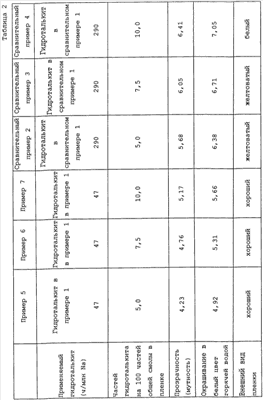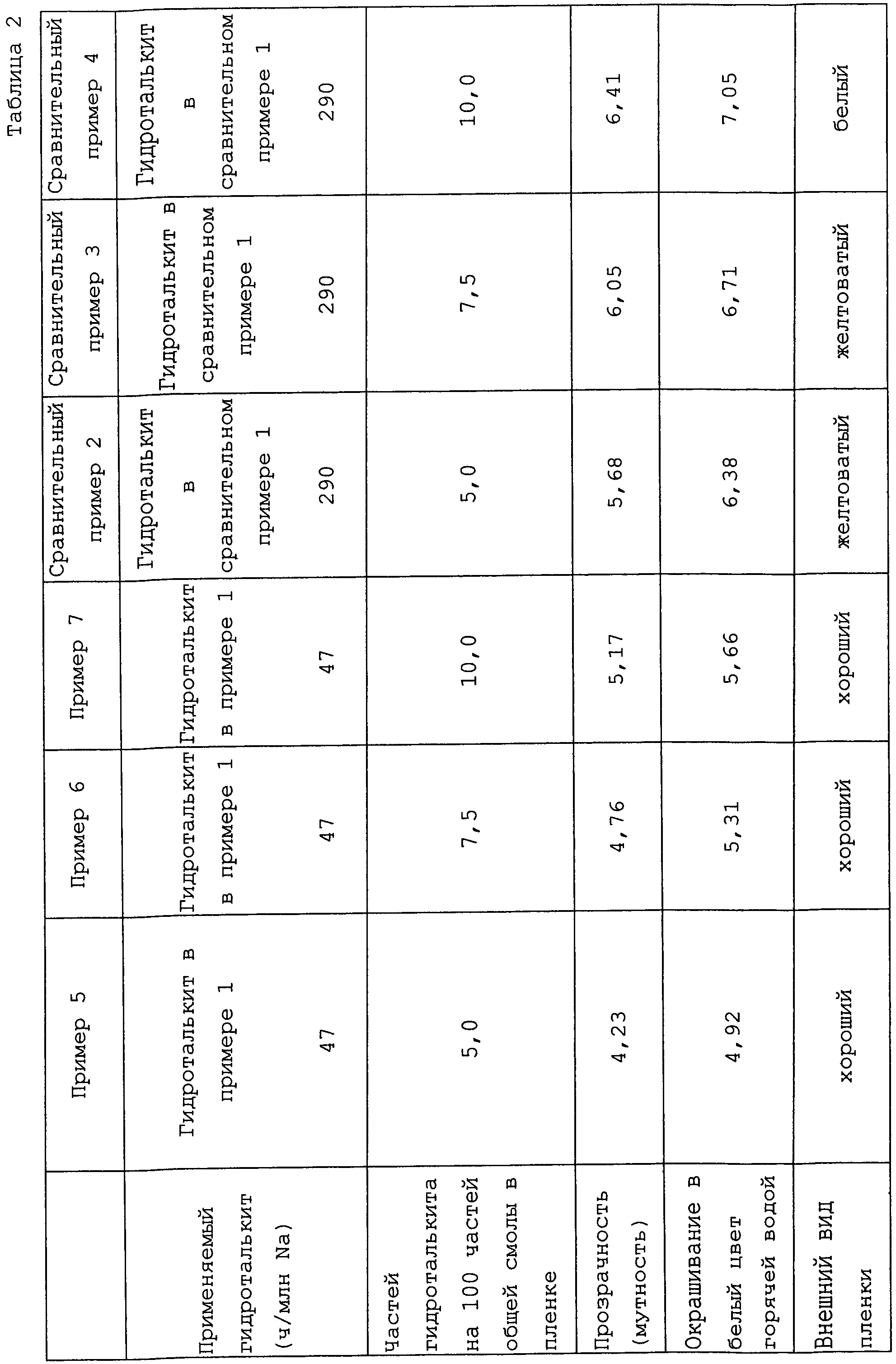 Из данных таблицы 2 становится ясным, что, когда применяют гидроталькит, в котором содержание Na, находящегося на поверхности и внутри гидроталькита, составляет 47 ч./млн, окрашивание в белый цвет под действием горячей воды не появляется, даже если количествами добавленного гидроталькита являются 5,0, 7,5 и 10,0 мас. частей. Кроме того, эти пленки имеют превосходную прозрачность и внешний вид пленки.