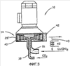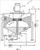 При обработке в устройстве 14 для измельчения и распыления взвесь гидроксида кальция образует очень мелкие капли и частицы, которые диспергируются из устройства 14 в секцию 34′ газового пространства, окружающего устройство. Мелкие капли и частицы вылетают из устройства 14, главным образом из области его внешнего кольца, в виде туманоподобного потока 36. Реакции осаждения вне устройства подачи могут продолжаться в течение относительно длительного времени, так как мелкие капли и частицы широко диспергируются в резервуаре осаждения 12. Осажденный карбонат кальция и возможно некоторый неосажденный гидроксид кальция опускаются на дно резервуара осаждения и выгружаются из данного резервуара через трубопровод 20.
