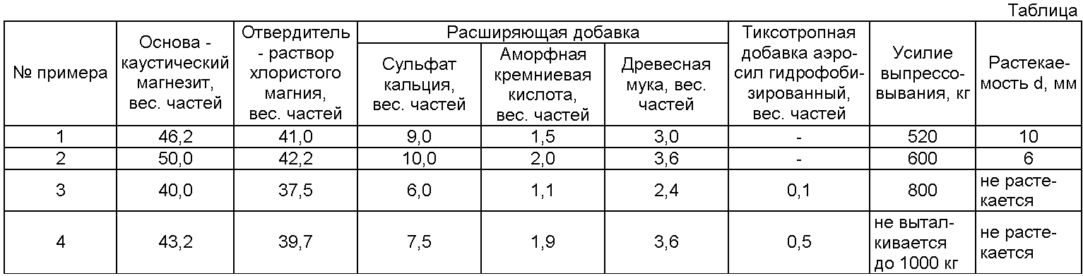 и соотношении указанных порошкообразных компонентов и отвердителя, мас.%: 55-60:40-45. Удельная поверхность аэросила гидрофобизированного составляет диапазон – 300-380 м2/г. В настоящем изобретении была достигнута обратимая тиксотропная структура в результате введения в состав вяжущего (на водной основе) гидрофобизированного аэросила (пирогенный диоксид кремния, обработанный алкоксисиланами) с высокой удельной поверхностью (300-380 м2/г). Обязательным условием получения тиксотропной структуры является модификация поверхности частиц аэросила гидрофобным модификатором, например, полидиметилсилоксаном или другими алкилсилоксанами (марка «аэросил гидрофобизированный»). Наличие последних на поверхности высокодисперсных частиц аэросила препятствует его смачиванию в составе вяжущего и обеспечивает формирование пространственной сетчатой структуры, способной к распаду при механическом воздействии и восстановлению при снятии нагрузки. Вследствие нерастворимости аэросила в водно-солевой среде и отсутствия образования гидратов он не участвует во взаимодействии с кальция сульфатом. Обычно аэросил (без гидрофобизирующего покрытия) используется как антислеживатель для сыпучих материалов и для загущения (повышения вязкости) водных составов, например, в фармацевтической промышленности. Аэросил гидрофобизированный используется в производстве лаков и красок (также для загущения) на органической основе. Авторы применили гидрофобизированный аэросил в составе цементной массы на водной основе и за счет несмачивания его поверхности и образования сетчатой проникающей структуры получили эффект тиксотропии, обозначенный как техническая задача изобретения. Технический результат, получаемый при реализации изобретения, состоит в обеспечении возможности регулирования в широком диапазоне реологических характеристик состава вяжущего от вязко-текучего до тиксотропного (т.е. текучего только под влиянием внешнего силового воздействия) состояния. Проведенные авторами исследования показали, что получение технического результата, воспроизводимость свойств материала и регулирование его эксплуатационных свойств достигается варьированием соотношений компонентов в указанных пределах. Изготавливают магнезиальное вяжущее следующим образом. 1. Готовят расширяющую добавку путем смешения расчетных количеств кальция сульфата, древесной муки и аморфной кремниевой кислоты. 2. Вводят расчетное количество аэросила (структурирующая тиксотропная добавка) при перемешивании в состав расширяющей добавки по пункту 1. 3. Готовят смесь основы – порошка каустического магнезита с расширяющей и структурирующей добавками, в расчетных количествах, полученных по пункту 2. 4. Готовят в отдельном реакторе отвердитель – водный раствор хлористого магния (или бишофита) путем смешения указанной соли с водой (в расчетных количествах) до полного растворения. 5. Цементную сырую массу готовят смешением порошкообразной части, изготовленной по пункту 3 с отвердителем, полученным по пункту 4, при соотношении порошок/отвердитель в расчетных количествах. Для определения уплотняющих свойств состава магнезиального вяжущего готовят образцы, заполняя полые толстостенные цилиндры с внутренним диаметром 20 мм и высотой 50 мм сырой массой. Отверждение образцов проводят