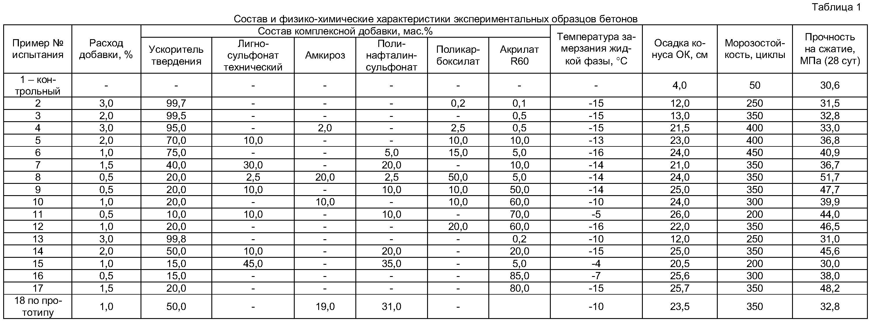 Изобретение относится к области строительных материалов, в частности к составам комплексных добавок, которые используются в производстве бетонных смесей и строительных растворов. Для обеспечения возможности выполнения строительных работ в зимнее время в состав бетонных и растворных смесей вводят комплексные добавки, которые способствуют твердению цемента при отрицательных температурах. Известна комплексная добавка в бетонные смеси (патент России Недостатком известной комплексной добавки является наличие в ее составе 12-18% органического компонента – недостаточно сильного пластификатора, который замедляет процессы структурообразования в бетоне и снижает противоморозное влияние добавки, при этом не позволяет значительно повысить пластические характеристики бетонной смеси при необходимом уменьшении количества воды затворения. Кроме того, состав ускорителя твердения недостаточно эффективен для снижения температуры замерзания жидком фазы в строительных растворах до -14 Известна также добавка, которая входит в состав вяжущего для бетона из портландцементного клинкера и гипса в количестве 1,0-3,0 мас.% по патенту Украины Добавка содержит фильтрат технический пентаэритрита на основе формиата натрия и в соответствии с изобретением в качестве добавки – твердый продукт производства синтетических жирных кислот на основе сульфата натрия при таком соотношении компонентов, мас.%: твердый продукт сульфатных вод производства синтетических жирных кислот на основе сульфата натрия – 2,0-4,0; фильтрат технический пентаэритрита на основе формиата натрия – 1,0-3,0. Но температура замерзания жидкой фазы при применении этой добавки составляет лишь -10 Наиболее близкой по технической сущности и достигаемому техническому результату является комплексная добавка в бетонные смеси и строительные растворы по патенту РФ Добавка обеспечивает увеличение по отношению к прототипу прочности и морозостойкости бетонов, но не позволяет достигать необходимой повышенной морозостойкости и сниженной до -14 В основу изобретения поставлена задача усовершенствования состава добавки, повышения ее антиморозных свойств, прочности и морозостойкости бетона, а также пластичности строительных растворов путем добавления к ускорителю твердения – смеси балластных солей на основе тиосульфата и роданида натрия более эффективных ускорителей твердения, а также использование в качестве пластификаторов – супер- и гиперпластификаторов. Поставленная задача решается тем, что комплексная добавка в бетонные смеси и строительные растворы, содержащая ускорители твердения в качестве смеси балластных солей на основе тиосульфата и роданида натрия и пластификатор, отличается тем, что содержит в качестве пластификатора акрилат R60, а ускоритель твердения дополнительно содержит соль муравьиной кислоты и при необходимости ацетат натрия при следующем соотношении компонентов, мас.%: