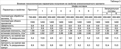 Изобретение относится к получению гранулированных керамических материалов, предназначенных для использования в качестве расклинивающих агентов – пропантов при добыче нефти и газа методом гидравлического разрыва пласта. Технический результат – снижение температуры обжига гранулированного материала для получения высокопрочных алюмосиликатных пропантов. Способ получения алюмосиликатного пропанта включает брикетирование огнеупорного глинистого сырья, термическую обработку брикета при температуре 850-900°С, дробление обожженного брикета до размеров 1-2 мм, совместный тонкий помол сухим способом до размеров менее 0,063 мм с упрочняющей добавкой, гранулирование сырьевой смеси до насыпной плотности гранул не менее 1,0 г/см3 и обжиг гранул при температуре 1400-1450°С. Состав для получения указанного пропанта содержит в качестве огнеупорного глинистого сырья обогащенный каолин или огнеупорную глину с содержанием глинистых минералов не менее 80%, в том числе каолинита не менее 70%, свободного кварца не более 5%, щелочных оксидов не более 1,0-1,5%, в качестве упрочняющей добавки – железооксидную добавку из группы пиритные огарки или железная руда с содержанием FeO+Fe2O3 не менее 65% при их соотношении, мас.%: обожженное глинистое сырье – огнеупорная глина или обогащенный каолин – 90,0-93,5, железооксидная добавка 6,5-10,0. 2 н.п. ф-лы, 3 табл.