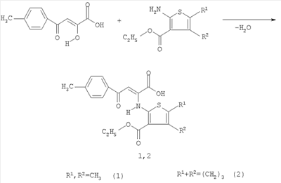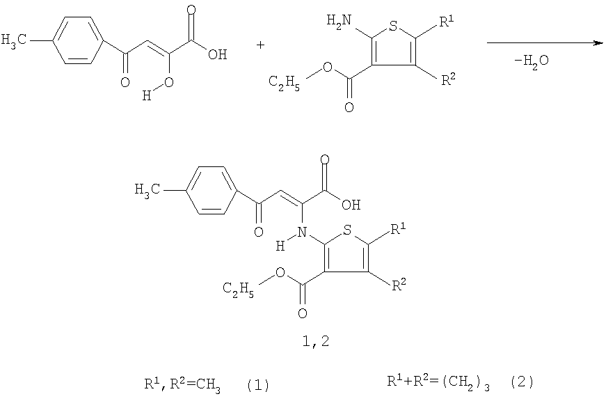Поставленная задача достигается получением 4-(4-метилфенил)-4-оксо-2-{[3-(этоксикарбонил)-4,5-диметил-2-тиенил]амино}-2-бутеновой и (4-(4-метилфенил)-4-оксо-2-{[3-(этоксикарбонил)-5,6-дигидро-4Н-дигидроциклопента[b]тиофен-2-ил]амино}-2-бутеновой кислот, которые обладают противовоспалительной и анальгетической активностью. Заявляемые соединения 1,2 синтезируют взаимодействием 4-(4-метилфенил)-2,4-диоксобутановой кислоты с 4,5-дизамещенным этиловым эфиром 2-амино-тиофен-3-карбоновой кислоты в среде этилового спирта при 60°С с последующим выделением целевого продукта известными методами по схеме