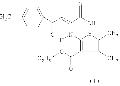 Пример 1. Получения соединения 1. К раствору 2.06 г (0.01 моль) 4-(4-метилфенил)-2,4-диоксобутановой кислоты в 20 мл этилового спирта прибавляют раствор 1.85 г (0.01 моль) этилового эфира 2-амино-4,5-димитил[b]тиофен-3-карбоновой кислоты в 20 мл того же растворителя и выдерживают при комнатной температуре 24 часа. Смесь охлаждают до 0°С, выпавший осадок отфильтровывают и перекристаллизовывают из ацетонитрила. Выход 2.91 г (78%). Т.пл. 167-168°С. Найдено, %: С 61.13; Н 5.11; N 3.74; О 21.43; S 8.57. C19H19NO5S. Вычислено, %: С 61.11; Н 5.13; N 3.75; О 21.42; S 8.59. ИК спектр (ФСМ 1201, вазелиновое масло, , см-1): 2953.94 (NH), 1675 (COO). Спектр ЯМР 1H (Varian Mercury300 (300 MHz), ДМСО-d6, ГМДС, , м.д.): 12.65 с (1H, NH); 7.88 м (4Н, аром); 6.46 с (1Н, С=СН); 4.32 к (2Н, ОСН2СН3); 2.36 с, 2.2 с, 2.18 с (9Н, 3СН3) 1.32 т (3Н, ОСН2СН3).