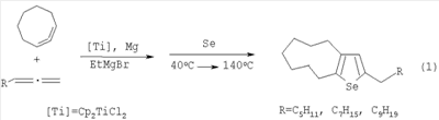 Целевые продукты (1) образуются только лишь с участием циклонона-1,2-диена и алка-1,2-диенов, EtMgBr, селена (Se), магния и катализатора Cp2TiCl2. В присутствии других катализаторов на основе комплексов переходных металлов (например, Zr(acac)4, Cp2ZrCl2, Pd(acac)2, Ni(acac)2, Fe(acac)3) целевые продукты (1) не образуются.