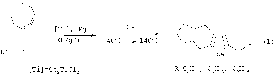 ПРИМЕР 1. В стеклянный реактор, установленный на магнитной мешалке, в атмосфере аргона помещают 1.2 ммоль Ср2TiCl2, 10 ммоль циклонона-1,2-диена, 10 ммоль окта-1,2-диена, 20 ммолей магния (порошок) и при температуре ~0°С 24 ммоль EtMgBr (1.6М раствор в Et2О). Перемешивают при комнатной температуре 7 час, затем добавляют 24 ммоль селена (Se), 10 мл бензола, удаляют перегонкой эфир, выдерживают реакционную массу в течение 6 час при температуре ~40°С, затем 1 час при температуре ~140°С. Получают индивидуальный 2-гексил-5,6,7,8,9,10-гексагидро-4Н-циклонона[b]селенофен с выходом 55%. Спектральные характеристики 2-гексил-5,6,7,8,9,10-гексагидро-4Н-циклонона[b]селенофена (1)