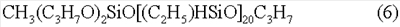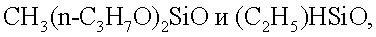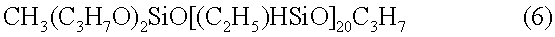 Способ получения аналогичен приведенному в примере 1. Берут 26,8 г (0,12 моля) метилприпропоксисилана, 180,0 г олигоэтилгидридсилоксана и 6,2 г катализатора и 10,0 г доломита для нейтрализации смеси. Получено 197 г бесцветной прозрачной жидкости формулы: