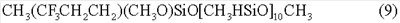 Способ получения аналогичен приведенному в примере 1. Берут 86,0 г (0,14 моля) 3-(1,1,2,2,3,3,4,4,5,5,6,6,7,7,8,8-гексадекафторнонилокси)пропилтриэтоксисилана, 120,0 г олигоэтилгидридсилоксана, 4,1 г катализатора и 9,3 г доломита для нейтрализации смеси. Получено 198 г бесцветной прозрачной жидкости формулы: