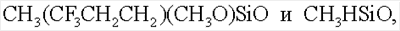 Способ получения аналогичен приведенному в примере 1. Берут 44,0 г (0,25 моля) метилтрифторпропилдиметоксисилана, 150 г олигометилгидридсилоксана, 5,8 г катализатора и 8,7 г карбоната кальция для нейтрализации смеси. Получено 185 г бесцветной, прозрачной жидкости формулы: