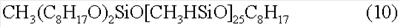 с содержанием HSi 0,67 мас.%, отношением атомов кремния в звеньях C8H17(C2H5O)2SiO и CH3HSiO, равным соответственно 1:3,2, и вязкостью 25 7,0 сСт. Выход целевого продукта составил 95%.