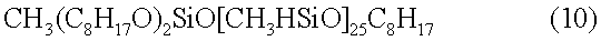 Способ получения аналогичен приведенному в примере 1. Берут 100,0 г (0,36 моля) октилтриэтоксисилана, 65,2 г олигометилгидридсилоксана и 4,9 г катализатора, 6,6 г карбоната магния для нейтрализации смеси. Получено 157 г бесцветной прозрачной жидкости формулы: