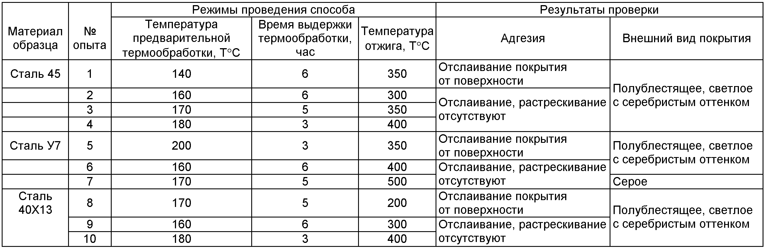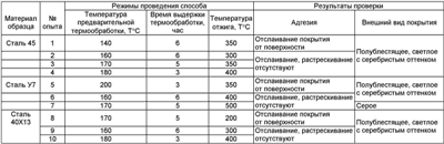 при температуре 40-45°С и катодной плотности тока 1-2 А/дм2. Металлические детали с гальваническим покрытием толщиной до 30 мкм подвергали диффузионному отжигу в инертной среде при температуре 300-400°С. Перечень металлов, используемых в предложенном способе, конкретные числовые значения режимов обработки и результаты проверки прочности сцепления получаемого покрытия с деталями приведены в таблице. Использование предлагаемого изобретения позволяет получить на поверхности металлических деталей прочносцепленное покрытие на основе никеля при сохранении его внешнего вида. Покрытие обладает повышенной твердостью, износостойкостью и характеризуется: – высокой прочностью (при испытании на перегиб пластины с толщиной покрытия 30 мкм выдерживают 250 перегибов); – коррозионной стойкостью (испытания покрытия проводились в камере влаги на образцах из стали 40Х13 в режиме: влажность 93%, температура 40°С, время выдержки 21 сутки, следов коррозии нет); – высокой жаропрочностью (выдержка в атмосфере воздуха до 500°С в течение длительного времени не дает цвета побежалости от салатового до синего, характерного для никелевого покрытия); – устойчивость к циклическим перепадам температур.