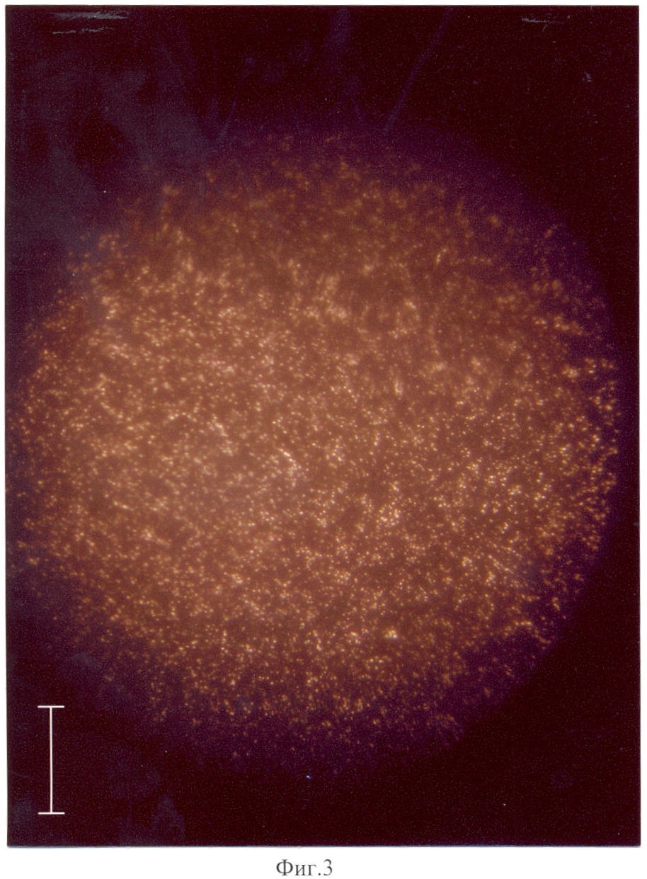 Процесс осуществляют следующим образом. В наполненную электролитом гальваническую ванну 2 помещают обрабатываемую деталь 1, как показано на фиг.1. От источника переменного напряжения 3 к обрабатываемой детали и ванне прикладывают переменное электрическое напряжение. При этом на поверхности обрабатываемой детали наблюдаются постоянно возникающие микродуговые разряды, сопровождающиеся звуковыми явлениями. В это время на поверхности обрабатываемой детали образуется оксидное покрытие. Толщина оксидного покрытия по мере ведения процесса растет, что сопровождается, как было указано выше, ростом напряжения, как показано на фиг.2, участок I. Происходит также рост амплитудного анодного и катодного токов IA и IK. При правильном соотношении IA/IK, которое должно быть меньше единицы, через определенный промежуток времени, длительность которого зависит от параметров процесса, таких как плотность тока, химический состав электролита и обрабатываемой детали, температура электролита, происходит самопроизвольное резкое падение амплитудного анодного напряжения, как показано на фиг.2, участок II. Такое снижение напряжения происходит всегда и объясняется прекращением возникновения воздушных пузырьков над каналами в оксидном покрытии, по которым течет электрический ток. Визуально это наблюдается как прекращение возникновения видимых микроразрядов на поверхности обрабатываемой детали. При этом под микроскопом на оксидируемой поверхности можно видеть множество разогретых точечных участков, как это показано на фиг.3. Далее продолжают ведение процесса, прикладывая электрическое напряжение, но при этом изменяя отношение IA/IK, что приводит к новому росту электрического напряжения, как показано на фиг.2, участок III. При этом происходит дальнейшее простое оксидирование поверхности (уже не микродуговое) и улучшение качества покрытия, полученного на первой стадии процесса.