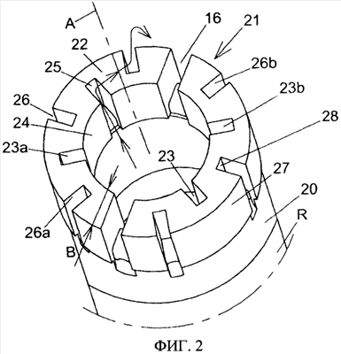 На фиг.2 показана бурильная колонна R, снабженная буровым долотом, сконструированным в соответствии с данным изобретением. Показанное долото, как обычно, имеет торец 21 долота для обработки материала, являющийся составной частью матрицы. Матрица имеет два сквозных радиальных паза 16 для подачи жидкости, которые функционируют в качестве промывочных каналов, с одной стороны, и в качестве охлаждающих каналов – с другой. Матрица также включает первую группу внутренних пазов 23 для подачи жидкости, количество которых в случае примера осуществления фиг.2 равно четырем и которые радиально расходятся наружу от внутренней поверхности 24 торца 21 долота, заканчиваясь внутренней нижней поверхностью 25 в торце 21. В матрице также есть группа наружных пазов 26 для подачи жидкости, количество которых в случае примера осуществления фиг.2 равно шести. Все эти наружные пазы 26 простираются в радиальном направлении внутрь от наружной поверхности 27 торца 21 долота, указанные группы заканчиваются наружной нижней поверхностью 28 в торце 21.