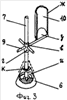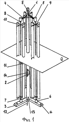 На фиг.1 представлен общий вид ветроэнергетической установки, на фиг.2 изображено сечение фиг.1 горизонтальной плоскостью Q; на фиг.3 изображено размещение конца оси в подпятнике; на фиг.4 показана крестовина, выполненная в виде воздушного винта.