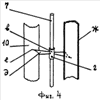 При воздействии воздушного потока ветровое колесо начинает вращаться вследствие того, что давление потока на вогнутую сторону желоба больше, чем на выпуклую сторону. Вследствие разницы давлений воздуха на вогнутую и выпуклую стороны желобов окружная скорость ветрового колеса будет ниже скорости ветра. Скругленные края ж желоба улучшают его аэродинамические качества, а скосы з препятствуют осаждению пыли, снега. При вращении ветрового колеса лопасти д, установленные наклонно между втулкой дополнительной крестовины и вершиной е на выпуклой стороне желоба, создают подъемную силу, уменьшающую осевое давление его (ветрового колеса) массы на подпятник или вал электрического генератора в зависимости от места их расположения.