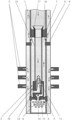 Далее в колонну 1 насосно-компрессорных труб сбрасывают съемную вставку 11 с соплом, камерой смешения и диффузором, которая при прокачке жидкости в колонне 1 насосно-компрессорных труб проходит через трубу 15 и самопроизвольно устанавливается в корпусе 10 струйного насоса 2.