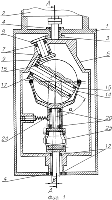 Усилитель управляющего воздействия содержит корпус 1 с установленным на нем силовым электродвигателем 2. На корпусе 1 закреплена шестерня 3, он также снабжен подшипниками 4, на которых смонтирован вращающийся корпус 5 с валом 6, соединенным с валом силового электродвигателя 2. Во вращающемся корпусе 5 на подшипниках 7 установлен промежуточный вал с шестернями 8 и 9, на подшипниках 10 – поворотная рама 11, а на подшипниках 12 – выходной вал 13. Кроме того, во вращающемся корпусе 5 закреплена ось 14, на которой на подшипниках 15 смонтировано фрикционное звено 16 со сферической рабочей поверхностью, снабженное шестерней 17, взаимодействующей с шестерней 9 промежуточного вала, и размещен управляющий поворотный электромагнит 18, вал которого через рычаг 19 связан с поворотной рамой 11. В поворотной раме 11 на подшипниках 20 установлено фрикционное звено 21, выполненное в виде обоймы с роликами 22, находящимися с рабочей поверхностью звена 16 во фрикционном контакте, создаваемом нажимным устройством, выполненным в виде упруго деформированных рычагов 23. Ось подшипников 10 (ось поворота поворотной рамы) выполнена перпендикулярной осям вращения корпуса 5 и фрикционных звеньев 16 и 21 и пересекающейся с ними в центре сферической рабочей поверхности звена 16. Между поворотной рамой 11 и стенкой вращающегося корпуса 5 установлена пружина 24. Вал фрикционного звена 21 шарниром равных угловых скоростей 25, допускающим линейное и угловое смещение соединяемых валов (см., например, справочное пособие «Механизмы» под ред. С.Н.Кожевникова, М.: Машиностроение, 1976 г., стр.383 385, рис.6.9), связан с выходным валом 13.