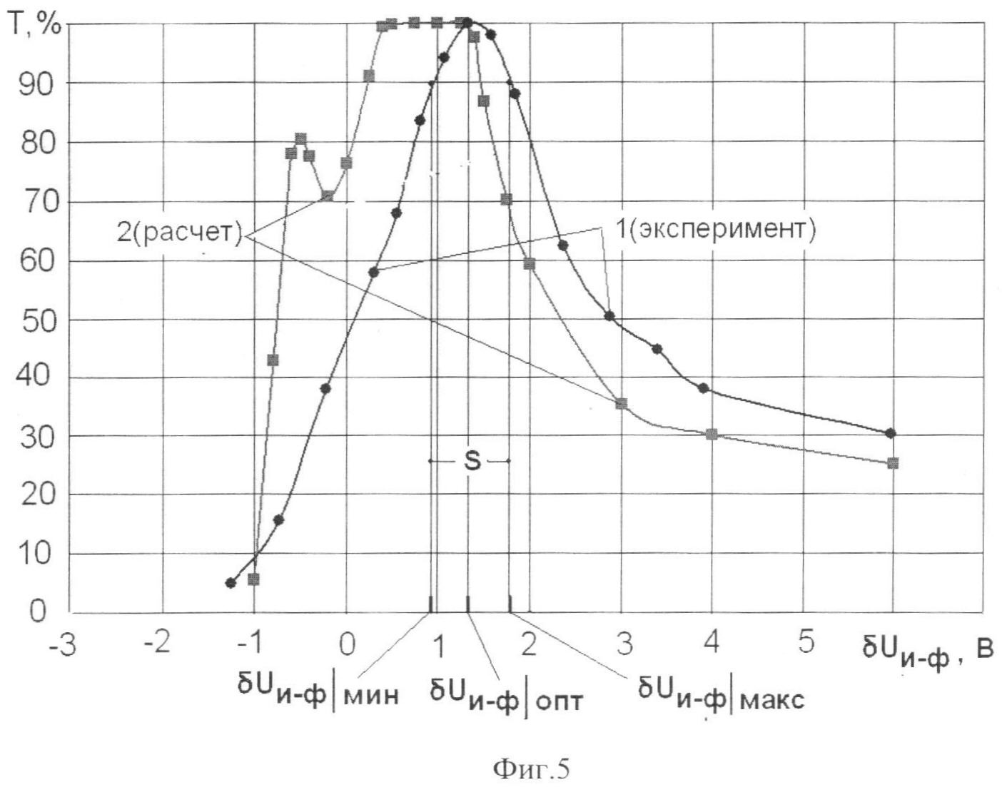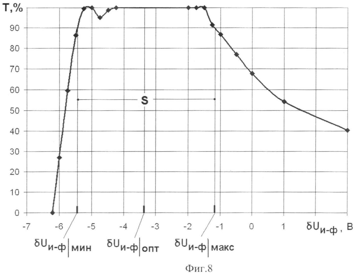 На фиг.8 показана функция токопрохождения Т=f( Uи-ф)|U=const предлагаемой АЛТ, рассчитанная методом компьютерного моделирования.