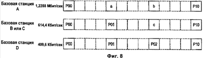 [103] В данном варианте осуществления настоящего изобретения из-за того, что базовые станции «В» и «С» используют для передачи данных дополнительные каналы в дополнение к главному каналу, эффективная скорость передачи данных общего широковещательного канала может оцениваться как 614,4 Кбит/с. Для базовой станции «D» в этом примере показано, что 1-й субпакет передается через главный канал, 2-й субпакет передается через 1-й дополнительный канал, а 3-й субпакет передается через 2-й дополнительный канал. Здесь в 1-м дополнительном канале, в котором используется смещение временного интервала, равное 5, и во 2-м дополнительном канале, в котором используется смещение временного интервала, равное 6, из-за использования для передачи данных двух дополнительных каналов, эффективная скорость передачи данных общего широковещательного канала может оцениваться величиной 409,6 Кбит/с.