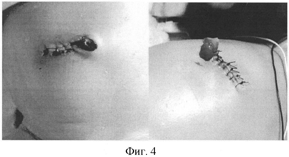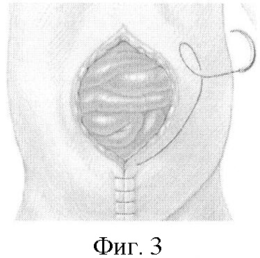 При омфалоцеле средних размеров используют непрерывный обвивной шов (фиг.3) (SPRINGER SURGERY ATLAS SERIES. Editors: J.S.P. Lumley., J.R. Siewert P., Puri., M.E. Hellwarth. Pediatric Surgery. (CHAPTER 16. Omphalocele. Stig Somme, Jacob C. Langer.) (CHAPTER 17. Gastroschisis. Marshall Z. Schwartz.) P.153-170).