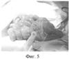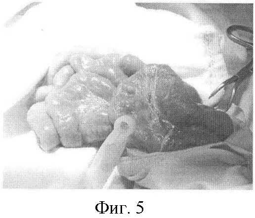 Данная беременность вторая, роды первые. Внутриутробно при ультразвуковом исследовании обнаружено, что внутренние органы эвентрированы, на основании чего поставлен диагноз: порок развития передней брюшной стенки – гастрошизис. После рождения, при осмотре у ребенка выявлен дефект передней брюшной стенки размерами 3,0×3,0 см, через который за пределы брюшной полости выходят петли тонкой и толстой кишки (фиг.5).