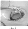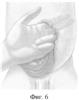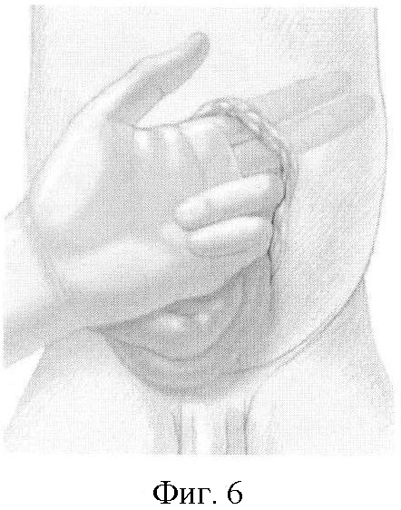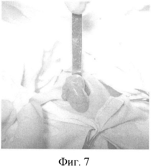 В связи с висцеро-абдоминальной диспропорцией (объем эвентрированных органов не соответствовал размерам брюшной полости) выполнено мануальное растяжение брюшной стенки (фиг.6).