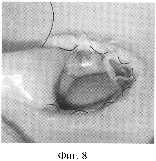 После полного погружения петель кишечника в брюшную полость наложен кисетный мышечно-апоневротический шов нерассасывающимся шовным материалом (PDS 2/0), отступя на 0,2-0,3 см от края дефекта. После чего наложен кисетный кожный шов по краю дефекта нерассасывающимся шовным материалом (PDS 4/0) (фиг.8).