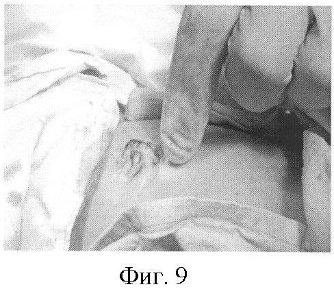 При висцеро-абдоминальной диспропорции (когда объем эвентрированных органов не соответствует размерам брюшной полости) проводится мануальное растяжение брюшной стенки (фиг.6). После полного погружения петель кишечника в брюшную полость (фиг.8) накладывают кисетный мышечно-апоневротический шов нерассасывающимся шовным материалом, отступая на 0,2-0,3 см от края дефекта. После чего накладывают кисетный кожный шов по краю дефекта нерассасывающимся шовным материалом (фиг.9). Затягивают и завязывают сначала мышечно-апоневротический, а затем кожный кисетный шов.