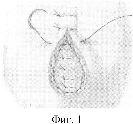 Одним из методов лечения гастрошизиса и омфалоцеле является радикальная первичная пластика передней брюшной стенки. Наиболее известным и широко используемым является способ послойного продольного ушивания передней брюшной стенки узловыми швами (фиг.1) (SPRINGER SURGERY ATLAS SERIES. Editors: I.S.P. Lumley, J.R. Siewert P., Puri., M.E. Hellwarth. Pediatric Surgery. (CHAPTER 16. Omphalocele. Stig Somme, Jacob C. Langer.) (CHAPTER 17. Gastroschisis. Marshall Z. Schwartz.) P.153-170).