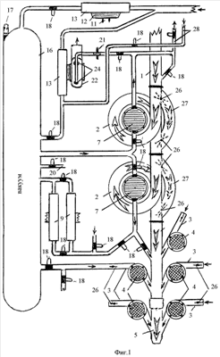 Вакуумный и пневматический насосы 7 и 8, установленные на эжекторную насадку 5, соединены между собой последовательно (обозначено на фиг.3 пунктиром) для уменьшения шума (Дб) и улучшения экологических норм.