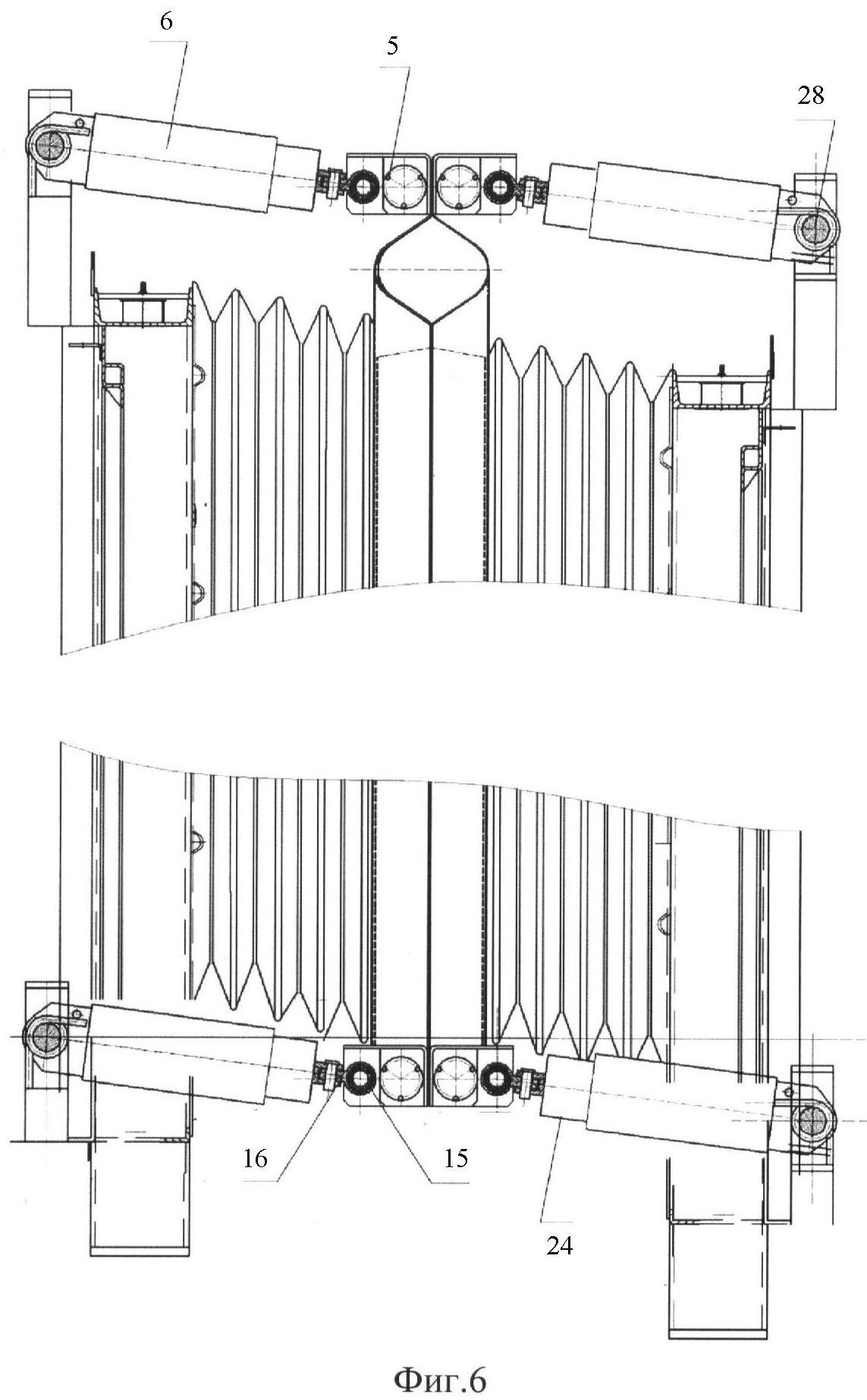 Для соединения с верхними и нижними амортизаторами 6 на сцепной раме сверху и внизу приварены соединительные балки 5 (фиг.1, 4). Соединительные балки выполнены из стального профиля 13 (фиг.4), по концам которого установлены две цапфы 14. В цапфах 14 закреплена труба 15, на которую надеты два ползуна 16 с кронштейнами 17. В профиле 13 со стороны вертикальной стенки приварены две цапфы 18, в которых параллельно трубе 15 закреплена труба 19. На трубу 19 надеты две пружины сжатия 20. Каждая пружина 20 одним концом упирается в соответствующую цапфу 18, а другой ее конец поджимается соответствующим упором 21. Каждый упор 21 отверстием на одном конце надет на трубу 19, а отверстием на втором конце на соответствующий ползун 16. Упор 21 имеет возможность вращаться и перемещаться относительно продольной оси трубы 19, относительно продольной оси ползуна 16 упор 21 может вращаться, но от перемещений вдоль оси ползуна 16 закреплен на нем гайкой 22.