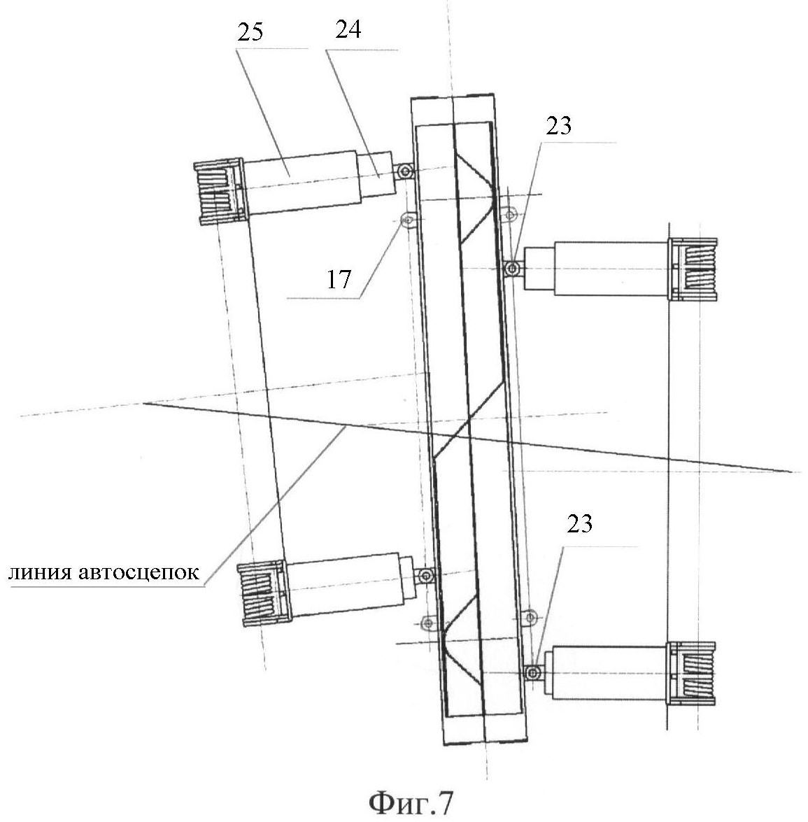 На фиг.7 – положение сцепных рам и амортизаторов при горизонтальных взаимных смещениях транспортных средств.