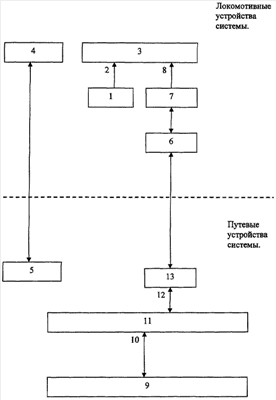 При движении поезда по кодируемым путям машинист руководствуется показаниями локомотивного светофора блока 1 автоматической локомотивной сигнализации и периодически подтверждает бдительность для предотвращения вырабатывания блоком 3 сигнала экстренного торможения. При проведении маневров при осаживании вагонами вперед пассажирского состава под посадку, блок 1 автоматической локомотивной сигнализации не принимает кодовых сигналов АЛСН и машинист ведет поезд, руководствуясь показаниями светофоров и указаниями руководителя маневров по поездной радиосвязи или громкоговорящей связи. Для предотвращения превышения поездом допустимой по условиям безопасности движения скорости блок 9 лазерного измерителя скорости и дальности непрерывно контролирует скорость и расстояние до приближающегося поезда. В памяти микропроцессора 11 находится подпрограмма вычисления допустимой скорости движения поезда при маневрах. Микропроцессор 11 с достаточно малой периодичностью сравнивает фактическую скорость поезда с расчетной допустимой скоростью и при превышении фактической скорости над расчетной допустимой скоростью через блок 13 стационарного приемопередатчика цифрового канала радиосвязи передает на локомотив сигналы служебного или экстренного торможения. Этот сигнал воспринимается блоком 6 бортового приемопередатчика цифрового канала радиосвязи и далее через блок 7 сопряжения воздействует на второй вход 8 управления блоком 3 торможения. Блок 3 реализует по полученному сигналу соответствующий режим торможения аналогично тому, как это делается в типовых системах (АЛСН, АЛС-ЕН, АЛСЕ-САУТ).