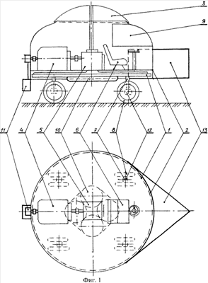 За прототип принято техническое решение по патентам на изобретение РФ 2291808, 2003 «Колесное транспортное средство» и 2342275, 2008 «Механизмы колесного транспортного средства», где разработаны общая компоновка, трансмиссия, привод управления, механизмы обеспечения возможности движения по двум колеям, амортизация колес и тормоза, механизм стабилизации башни.