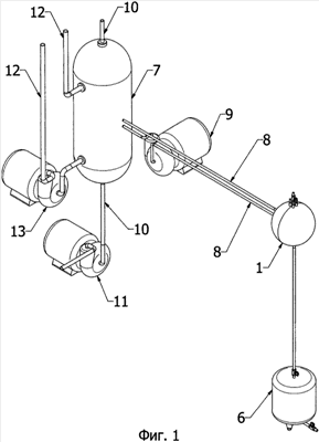 К теплообменнику 7 подведены магистрали 12, связанные с оболочкой (не показана) для несущего газа (например, гелия) для обеспечения подъемной силы летательного аппарата и ее регулирования. Циркуляция газа по магистралям 12 осуществляется насосом 13.